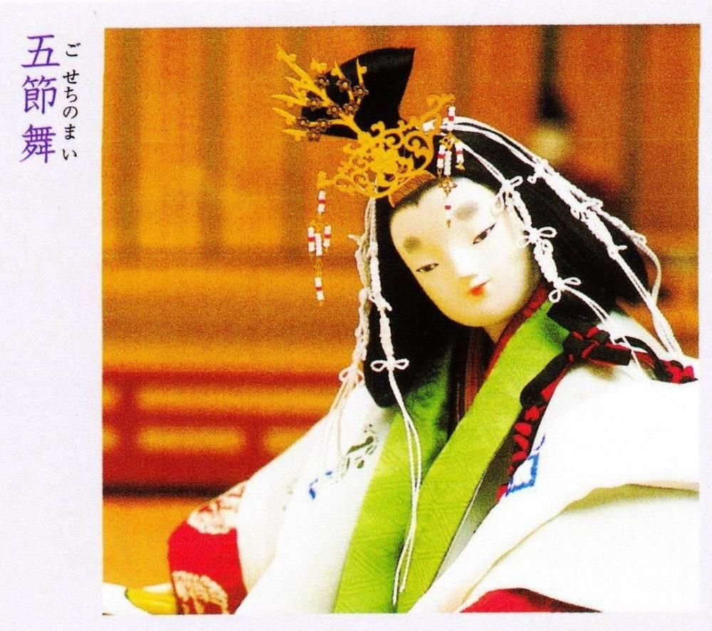新嘗祭は毎年の新穀を神に捧げ、天皇自らも神々と共に食する行事です。その翌日には天皇出御のもと豊明(とよのあかり)節会(せちえ)と呼ばれる宴会が開かれ、舞姫による五節(ごせち)舞(まい)が盛大に披露されました。舞姫達は日蔭(ひかげ)の蔓(かずら)という髪飾りをつけて登場します。